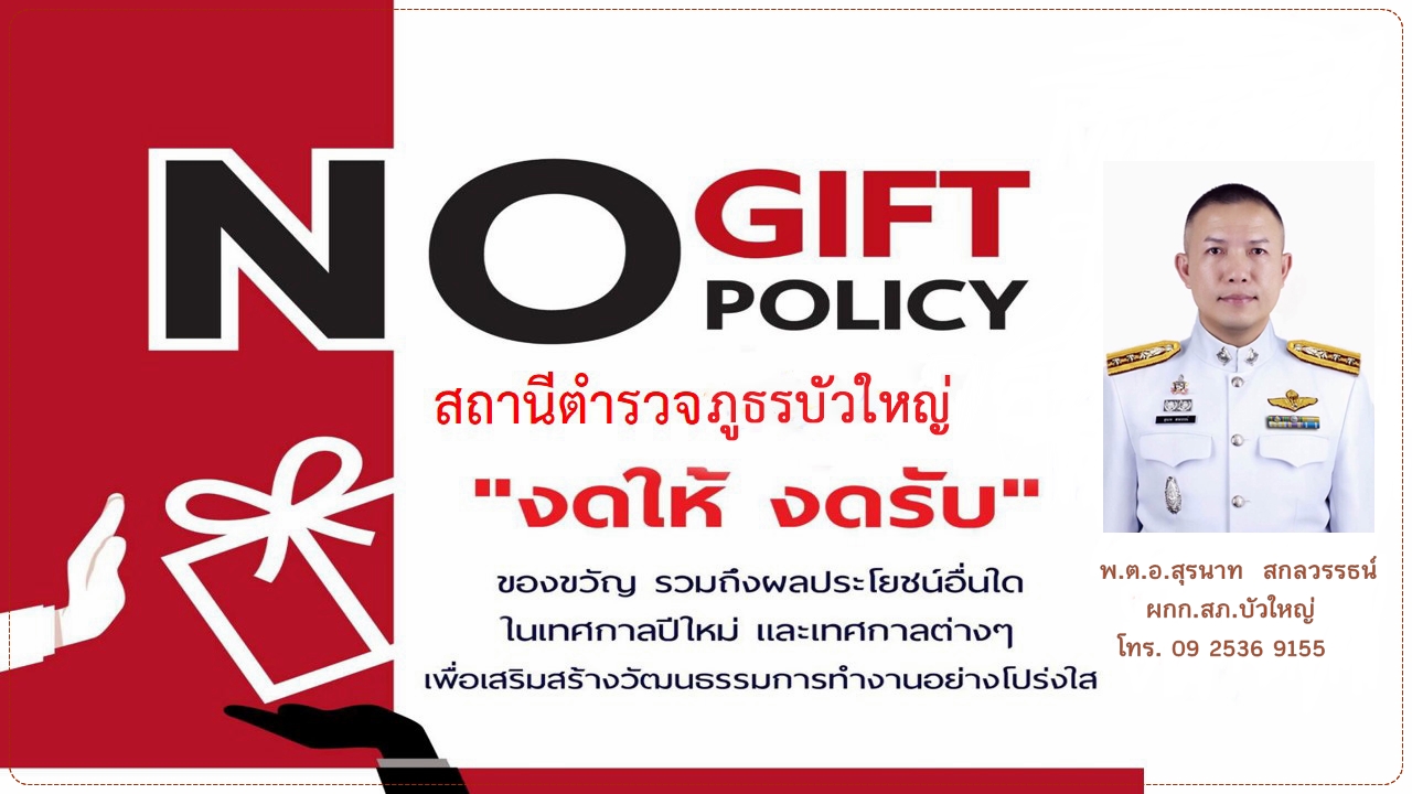 เผยแพร่ประชาสัมพันธ์ภาพอินโฟกราฟฟิกนโยบายไม่รับของขวัญและของกำนัลทุกชนิด (No Gift Policy) จากการปฏิบัติหน้าที่ ณ จุดบริการประชาชนและแต่ละแผนกงาน